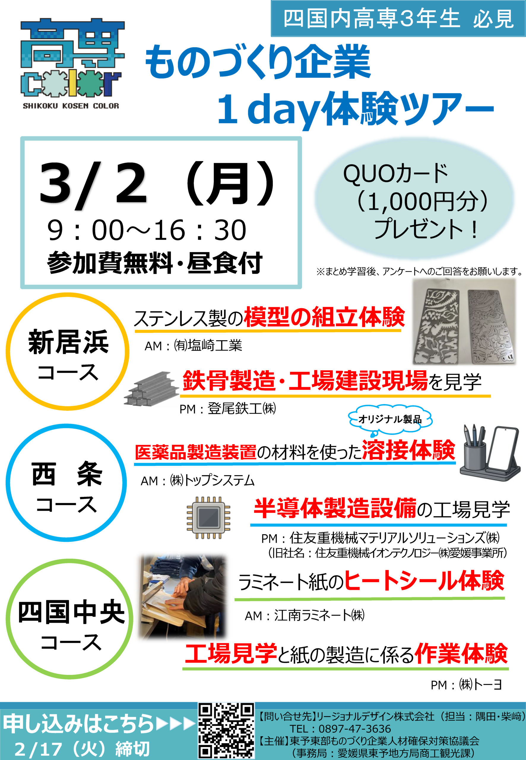 四国内の高専生を対象に「ものづくり企業1day体験ツアー」を開催します。