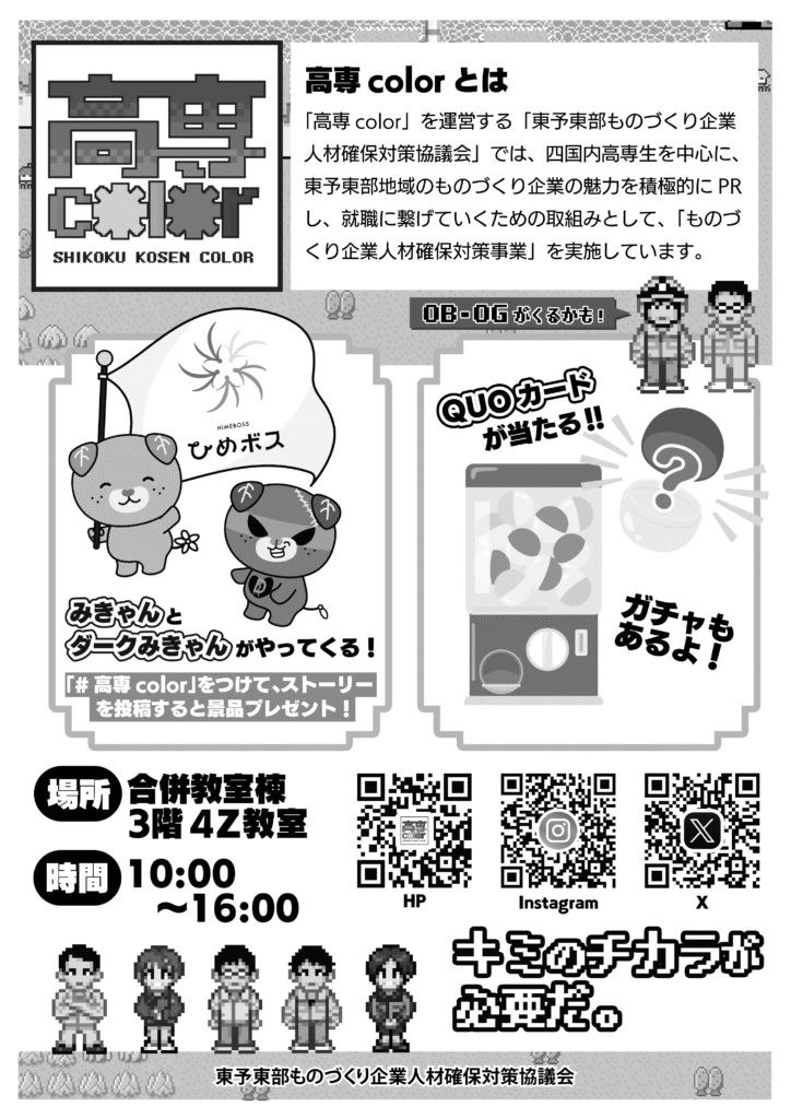 新居浜高専にて開催される『国領祭』に高専color出展します!! 昨年も出展しましたが今年も出展が決定しました! \今年はみきゃんとダークみきゃんが登場…!?/\景品などもあるかも…!?/ ぜひ会場にお越しください!! 開催日時 2024年11月2日(土)・... -